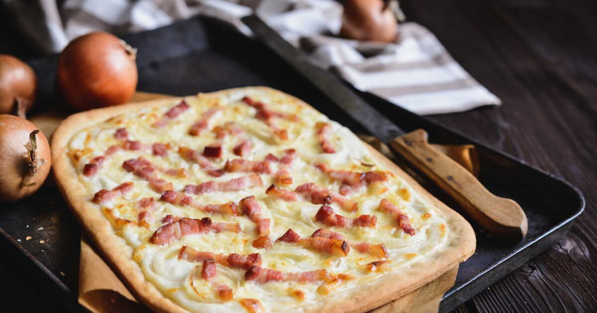 La flammekueche peut être agrémentée de fromage comme le munster ou des champignons pour encore plus de saveurs. Servez-la chaude, accompagnée d'une salade frisée assaisonnée à l'huile de noix pour un repas complet et délicieux.