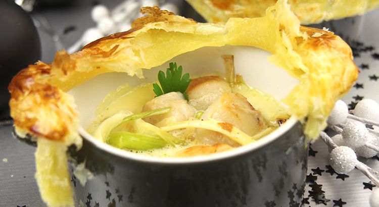 Découpez des cercles de pâte feuilletée en fonction du diamètre de vos cocottes. Badigeonnez-les d'un œuf battu pour une belle dorure. Disposez les poireaux au fond des cocottes, ajoutez la sauce filtrée, puis les saint-jacques par-dessus. Recouvrez le tout avec un cercle de pâte feuilletée et enfournez pendant environ 10 minutes. La pâte doit devenir dorée et gonflée. Servez bien chaud et savourez ce délice !