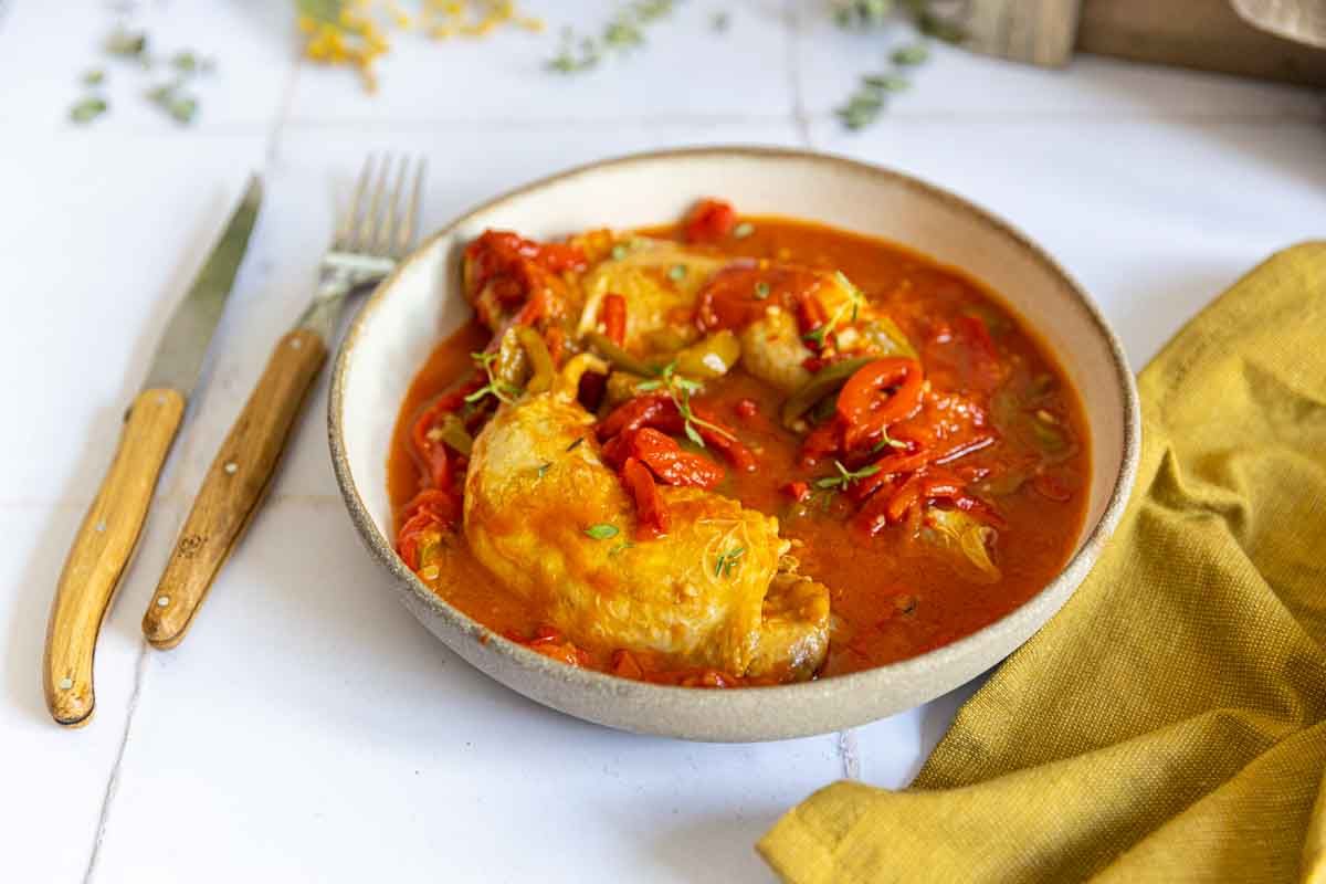 Le poulet basquaise est indéniablement un plat estival par excellence. Pendant longtemps, les poivrons cuits ne m'avaient pas séduite, mais un jour, j'ai tenté et ai découvert toute la richesse de ses saveurs. Surtout lorsqu'ils sont préparés avec soin, finement coupés et cuits longuement.
