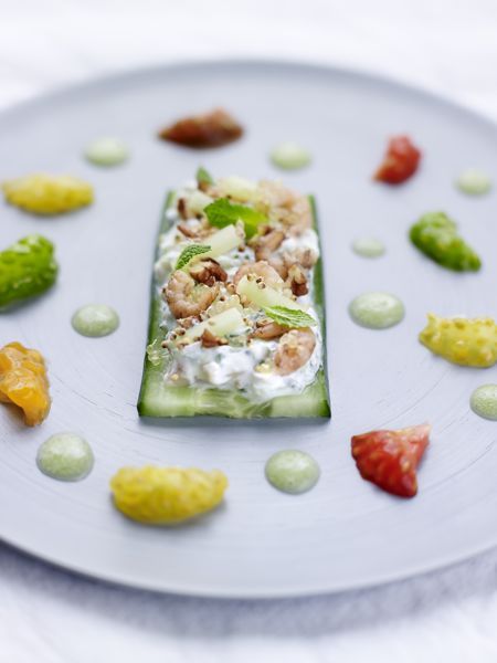 - Dressage : Dans une assiette, disposez le concombre gelé, le tartare de bulots, les crevettes, et les tomates confites, puis nappez de vinaigrette.